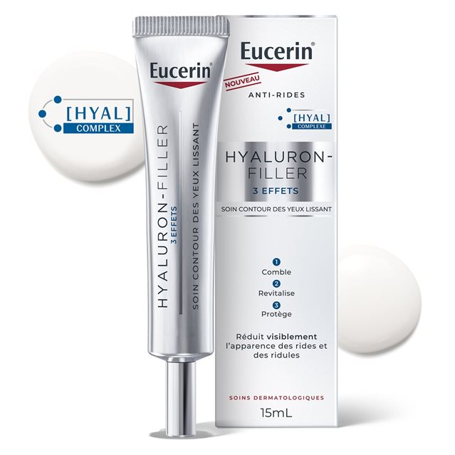 Ciblez les signes de l’âge grâce à notre innovation HYAL COMPLEXE. Avec l’âge, la production naturelle d’acide hyaluronique par la peau décline : des rides et des ridules apparaissent et la peau paraît plus âgée. Eucerin® a développé une solution de soin contour des yeux anti-âge qui réduit visiblement l’apparence des ridules de trois façons : 1) elle aide à atténuer l’apparence des rides grâce à un hydratant à base d’acide hyaluronique de haut et bas poids moléculaire; 2) elle réapprovisionne l’acide hyaluronique naturel pour revitaliser l’apparence de la peau; et 3) elle protège la peau contre les facteurs de stress environnementaux au moyen d’antioxydants. Cette approche à trois effets vous procurera une peau visiblement plus jeune, plus lisse et plus éclatante.