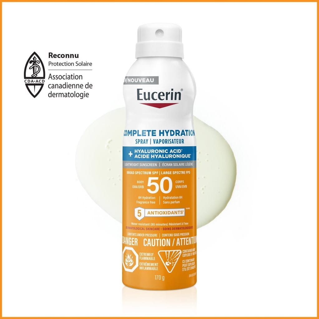 L’écran solaire en vaporisateur Eucerin Hydratation complète protège contre les rayons UVA/UVB et possède un complexe unique de 5 antioxydants (Bouclier 5 AntioxydantsMC) qui combattent les agresseurs environnementaux affaiblissant la barrière d’hydratation de la peau, pour une peau d’apparence plus saine. Il est offert dans un vaporisateur pratique pour les endroits difficiles à atteindre, sèche sans laisser de résidus visibles et est résistant à l’eau (pendant jusqu’à 80 minutes). Eucerin est une marque de soins développée avec des dermatologues et s’appuie sur une approche scientifique sans compromis.