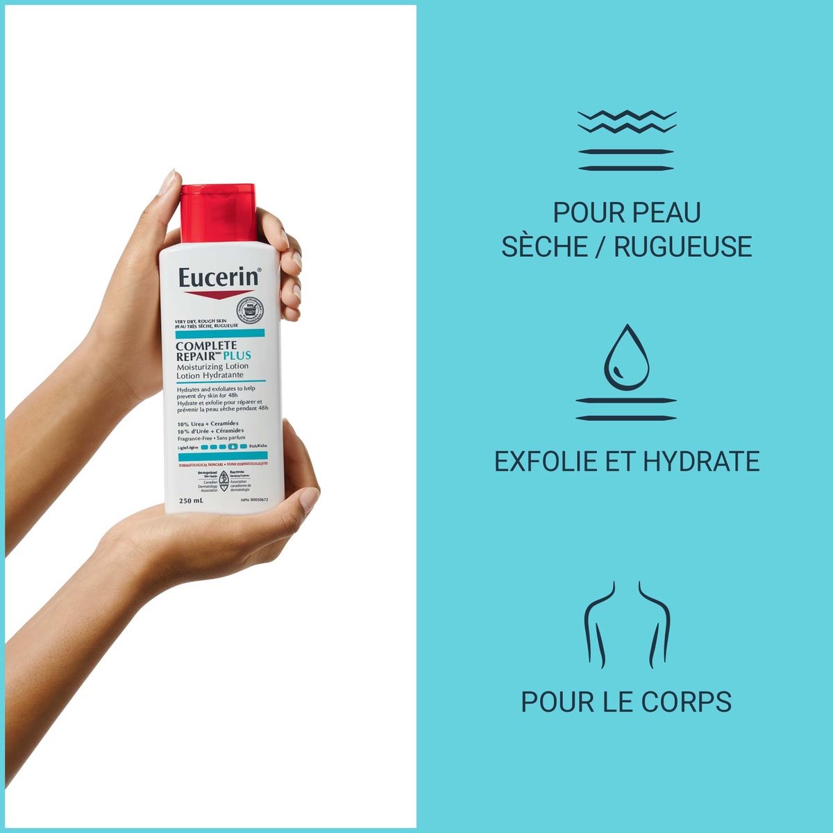 La Lotion intensive Complete RepairMC d'Eucerin avec 10 % d'urée contient une combinaison unique et très efficace d'ingrédients qui combattent les multiples facteurs clés qui causent la peau sèche :